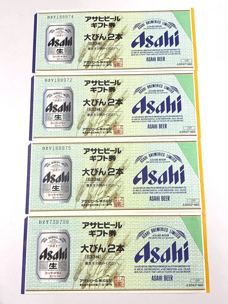 アサヒビール ギフト券 大びん2本 633ml 額面660円 ビール券 金券 チケット 飲料 ビール 4枚 をお持ち頂きました。